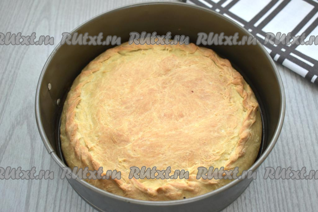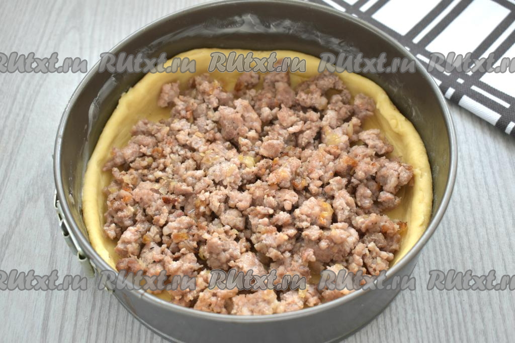 Отправляем пирог из песочного теста с фаршем в разогретую до 180 градусов духовку на 35 минут (до лёгкого подрумянивания).