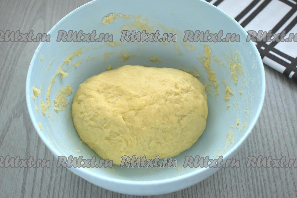 Вначале перемешиваем получившуюся смесь столовой ложкой, а затем быстро собираем руками в мягкий, однородный, не липнущий к рукам ком песочного теста. Если тесто будет сильно липнуть к рукам, тогда добавьте немного муки, если же тесто не будет собираться в ком (многое зависит от величины яиц и качества муки), тогда влейте 0,5 столовой ложки молока, быстро собирая тесто в ком. Долго вымешивать песочное тесто не нужно, достаточно просто собрать его в шар. Поместить тесто в целлофановый пакет (или завернуть в пищевую плёнку) и убрать в холодильник минут на 30.