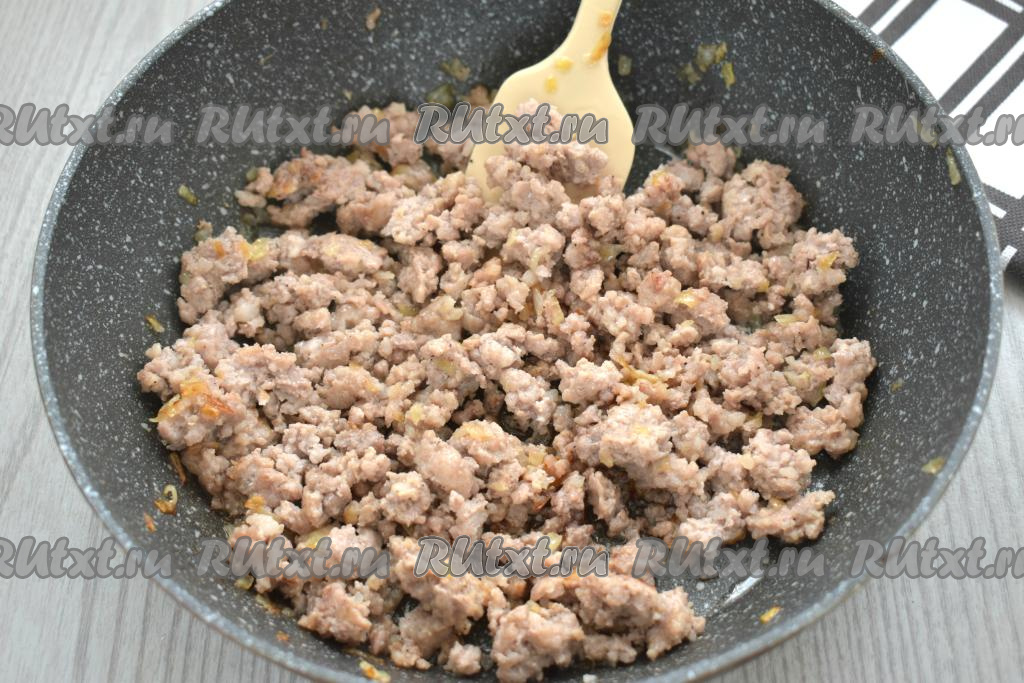 Периодически перемешивая и тщательно разбивая комочки мяса, обжариваем фарш с луком 8-10 минут, затем убираем с огня, даём остыть и начинка для пирога готова.