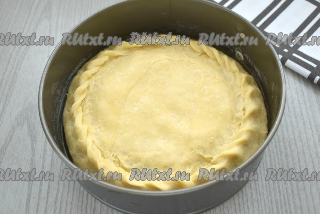 Второй кусок теста тоже раскатываем, накрываем им начинку и плотно скрепляем края.