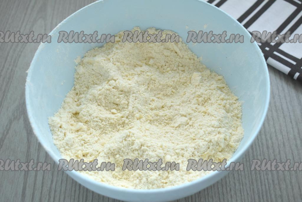 Руками перетираем муку с маргарином (или маслом) так, чтобы в итоге получилась мелкая, однородная крошка.
