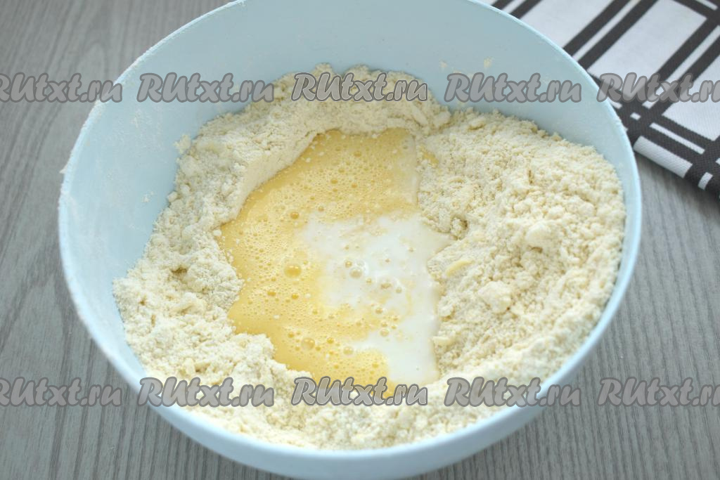 В отдельной миске взбиваем яйца венчиком (или вилкой) до однородности. В центре масляно-мучной смеси делаем углубление, вливаем в него яичную смесь и холодное молоко.