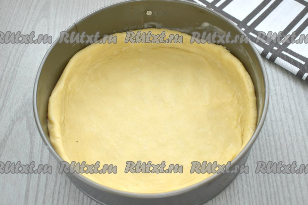 Охлаждённое песочное тесто делим на 2 неравных куска. Форму для выпечки (я взяла разъёмную форму диаметром 20 сантиметров) смазываем маргарином (или сливочным маслом). Больший кусок теста раскатываем и укладываем в форму для выпечки, поднимая бортики на 2,5 сантиметра.