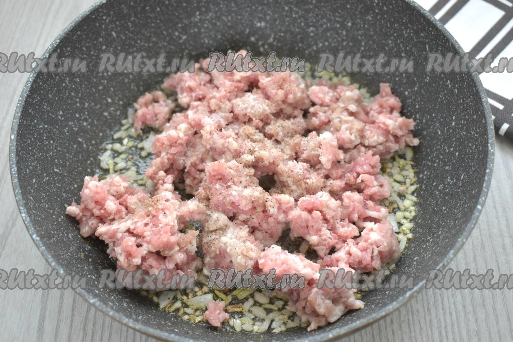 Добавляем к луку фарш, по вкусу солим и перчим, перемешиваем.