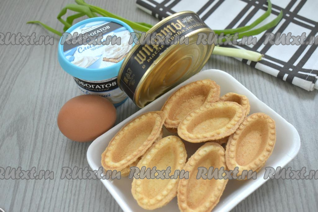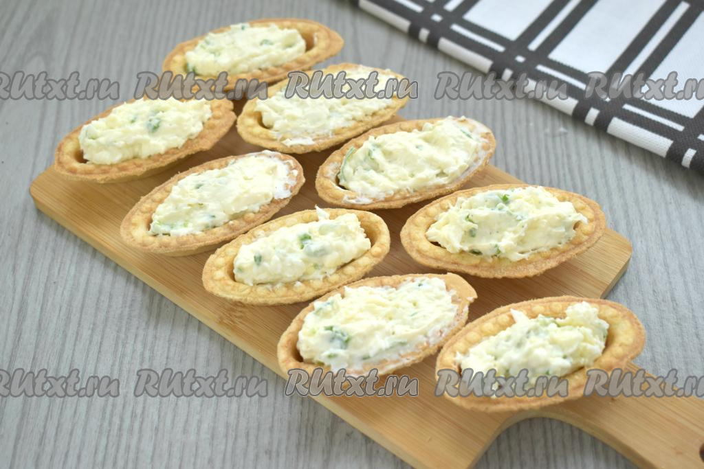 Начинку из творожного сыра и яиц разложить по тарталеткам.