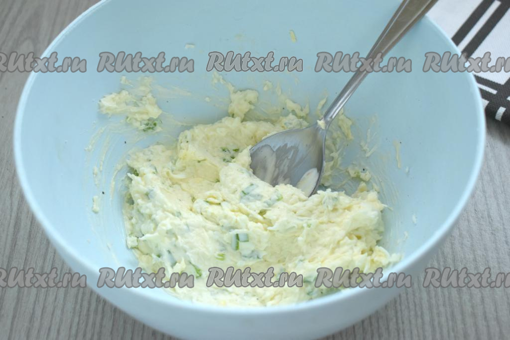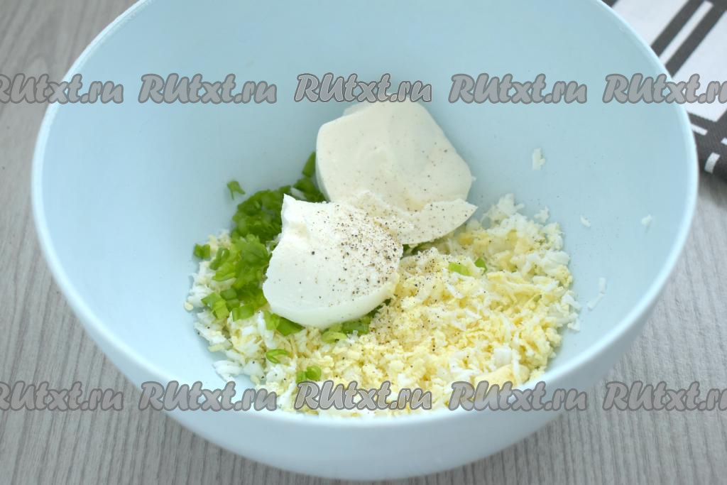 К натёртому яйцу добавить творожный сыр, мелко нарезанный зелёный лук (или другую свежую зелень), посолить и поперчить по вкусу.