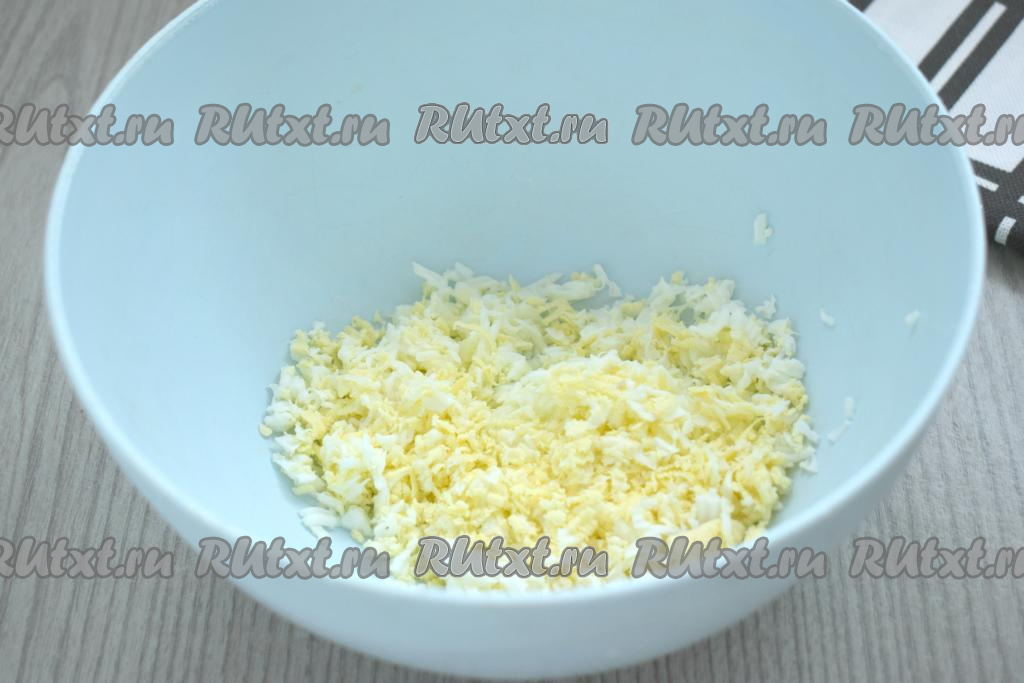 Теперь приступаем к приготовлению начинки для тарталеток. Варёное яйцо нужно натереть на мелкой тёрке в миску.