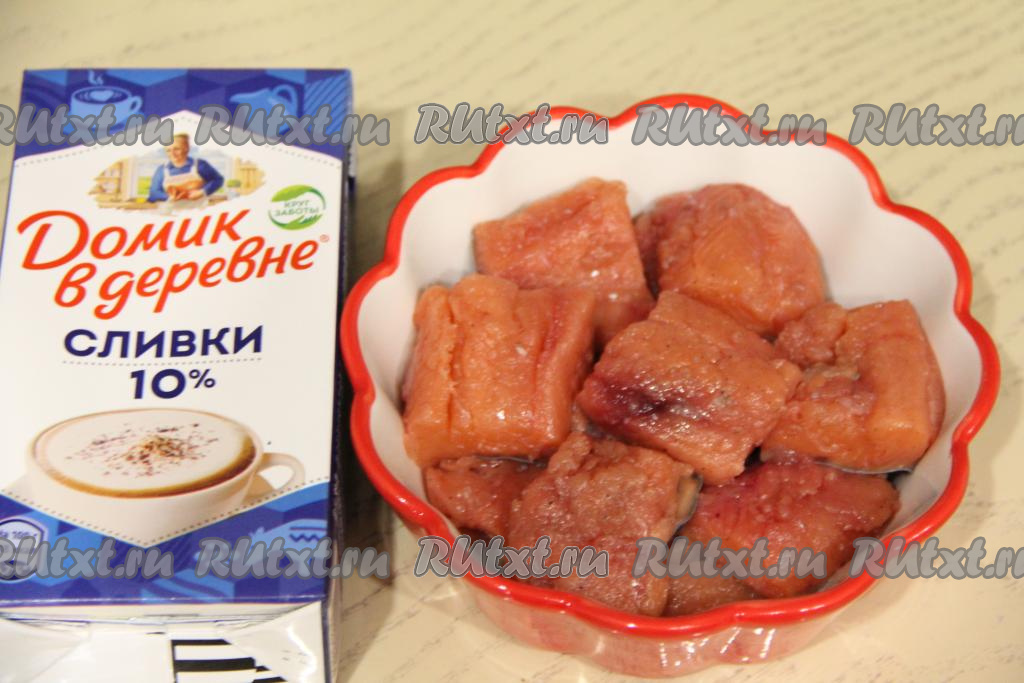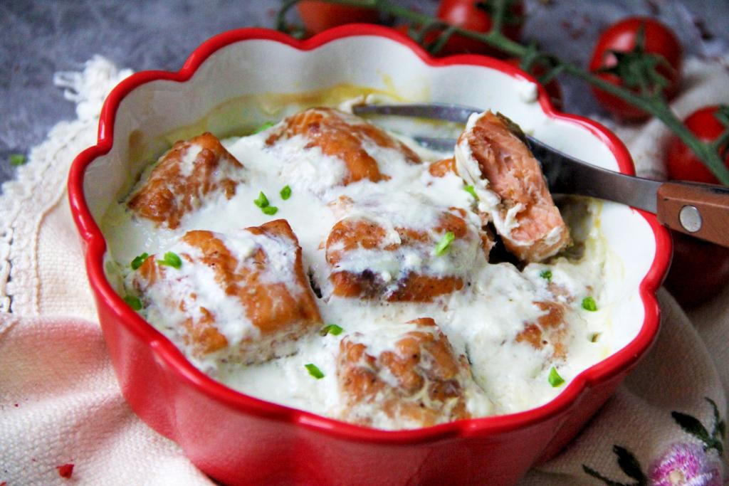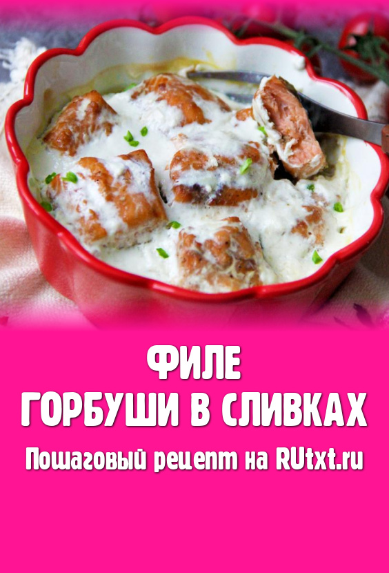 Выложить филе горбуши в жаропрочную форму. Рыбу практически полостью залить сливками и поставить в духовку, разогретую до 180 градусов, на 30 минут.