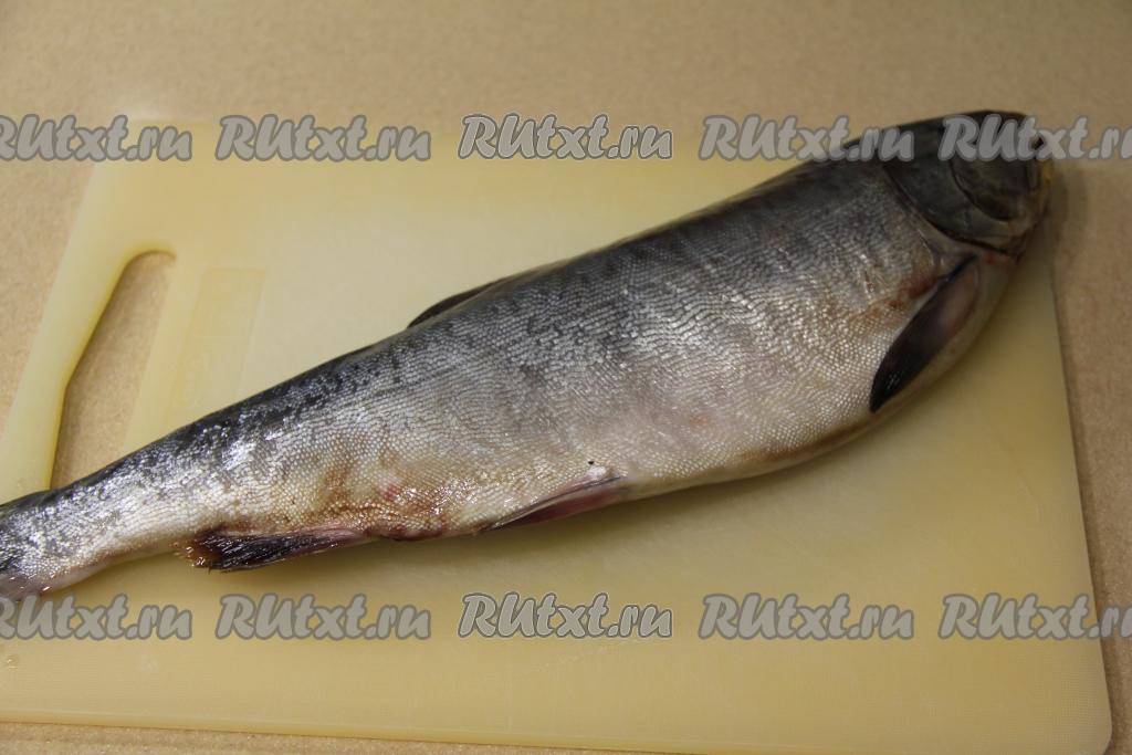 Для этого блюда можно купить филе горбуши и разморозить его. А я взяла целую тушку горбуши, разморозила при комнатной температуре, поскоблила кожу, удаляя чешую. А затем острым ножом срезала филе вместе с кожей с хребта рыбы. Крупные косточки удалила. При желании кожу можно тоже снять.
