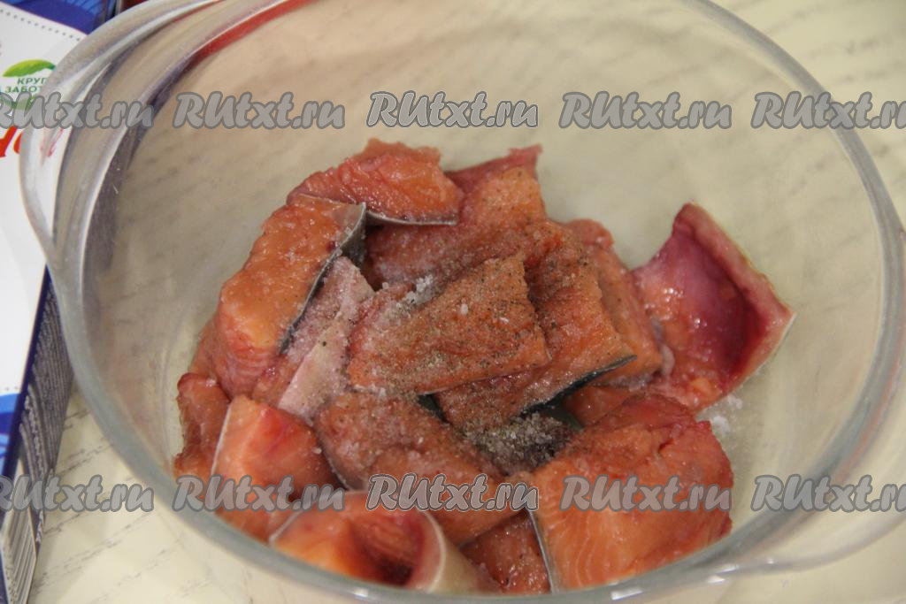 Кусочки филе горбуши сложить в миску, посолить, поперчить, перемешать.
