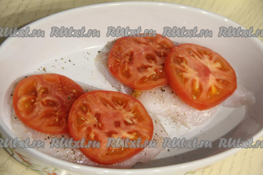 Помидор нарезать на кружочки. Выложить кружочки помидора поверх филе тилапии.