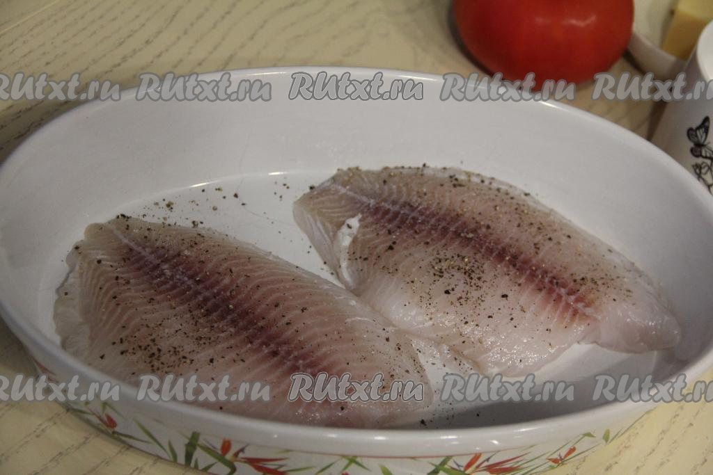 В форму для запекания в один слой выложить размороженное филе тилапии. Посолить рыбу по вкусу и приправить чёрным молотым перцем.