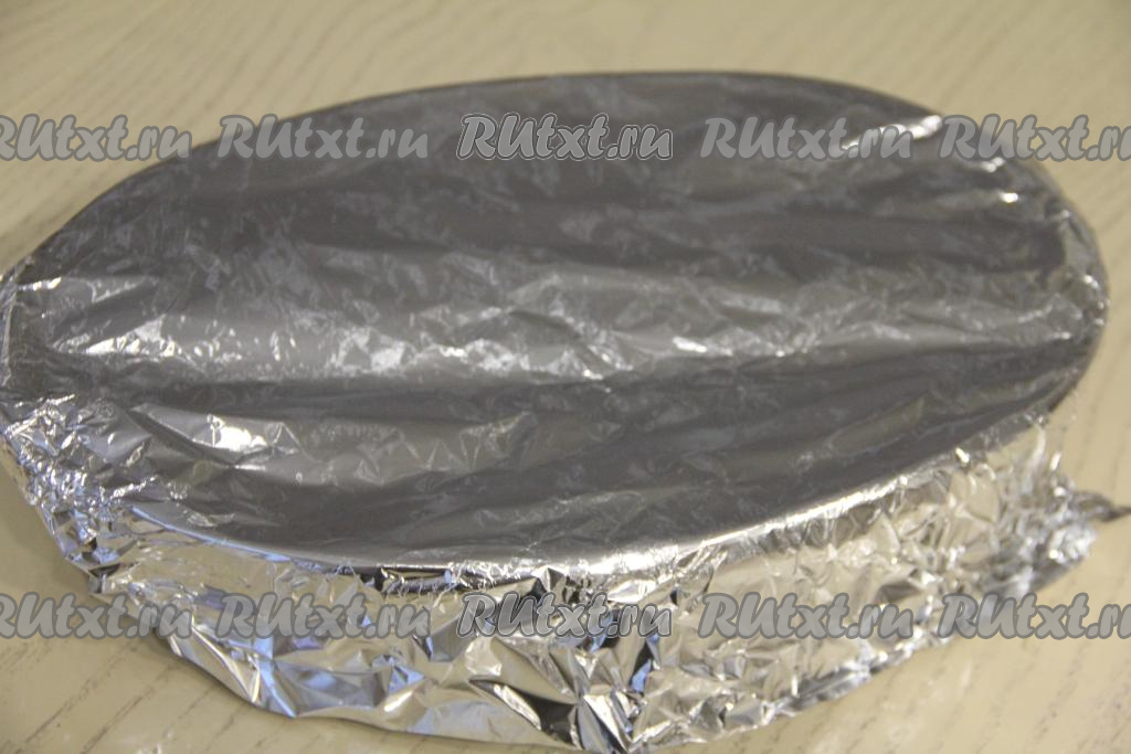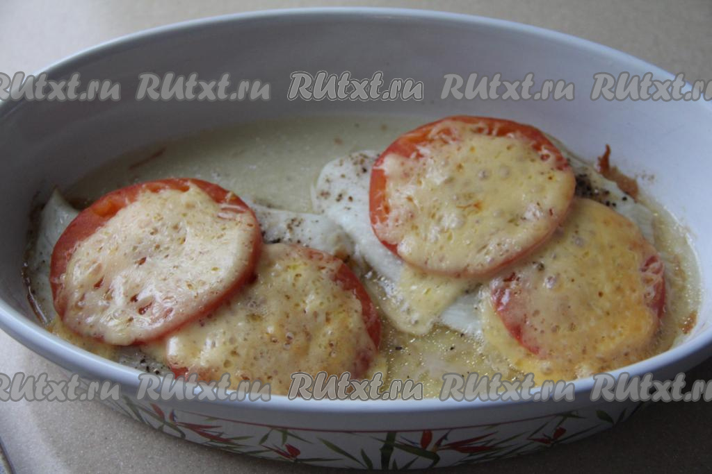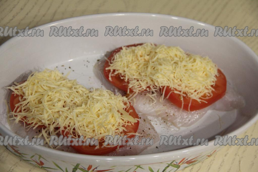 Форму с филе тилапии под помидорами и сыром накрыть фольгой и поставить в разогретую до 180 градусов духовку.