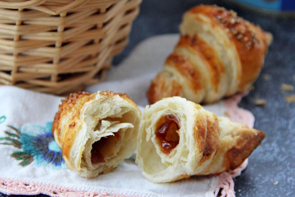 Готовые рогалики достать из духовки, дать немного остыть, а затем можно перекладывать на тарелку и подавать к столу.