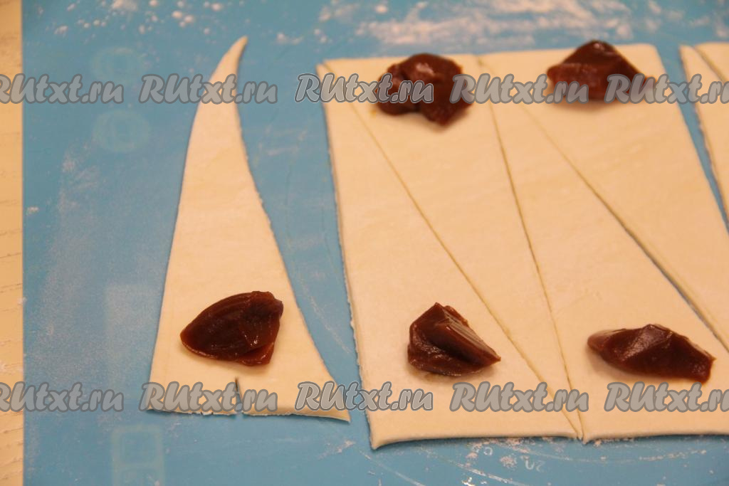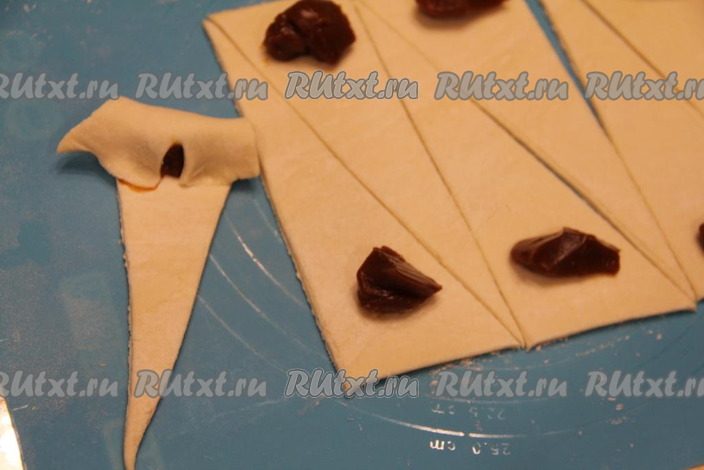 Ближе к основанию каждого треугольника, отступив от края теста примерно 1 сантиметр, выложить по 1 чайной ложке варёной сгущёнки.
