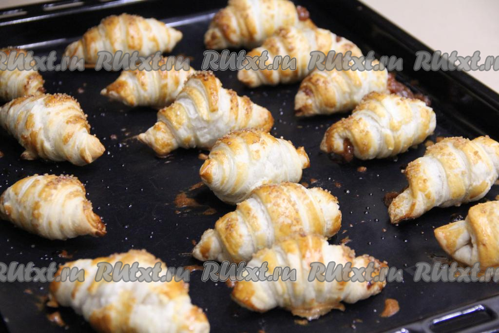 Поставить противень с рогаликами с варёной сгущёнкой в разогретую до 220 градусов духовку. Выпекать минут 20 (до золотистого цвета слоёного теста).
