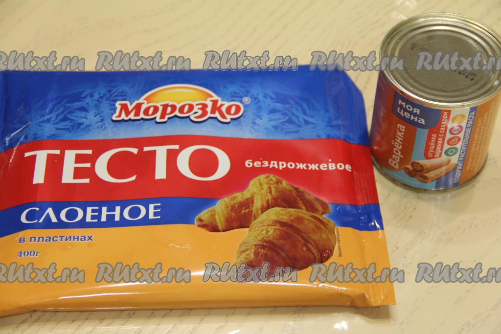 Для формирования рогаликов можно взять как бездрожжевое слоёное тесто, так и дрожжевое. В этот раз я купила бездрожжевое тесто. Разморозить слоёное тесто при комнатной температуре.