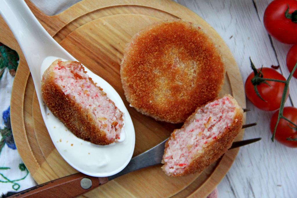 А вот как котлета, приготовленная из крабовых палочек с добавлением яиц, выглядит в разрезе. Нежные, аппетитные крабовые котлетки станут отличной альтернативой привычным рыбным и мясным котлетам, при подаче их можно дополнить любимым соусом и гарниром.