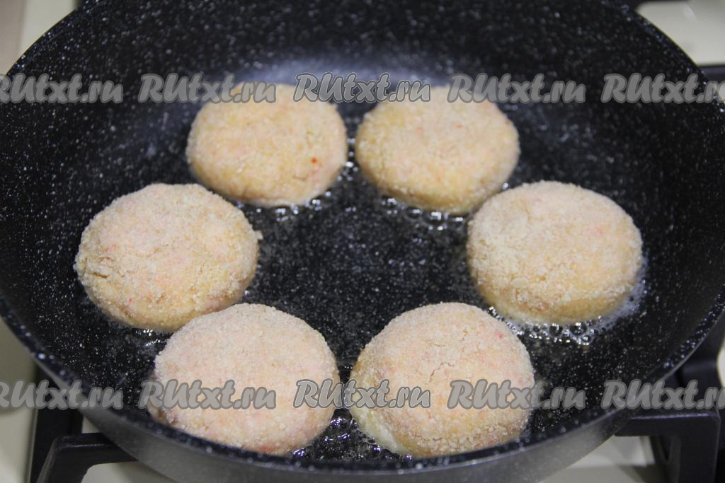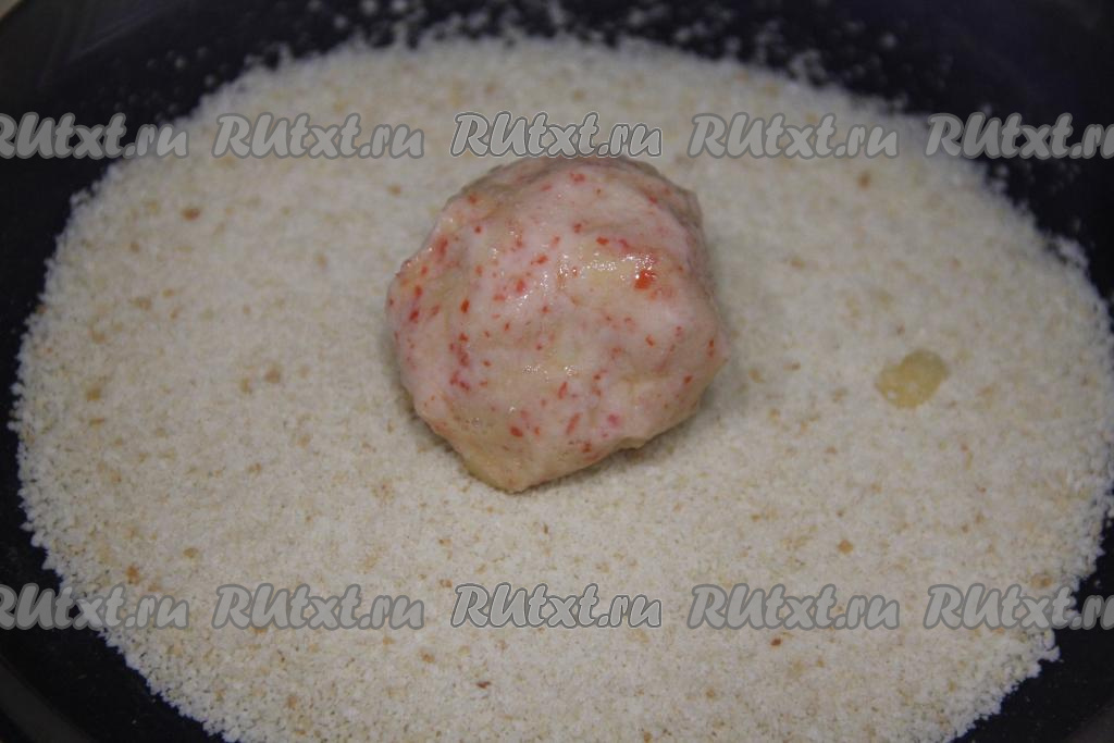 Затем обвалять шарик в панировочных сухарях со всех сторон и приплюснуть, придав форму округлой котлеты. Аналогично сформировать все 6 крабовых котлет.