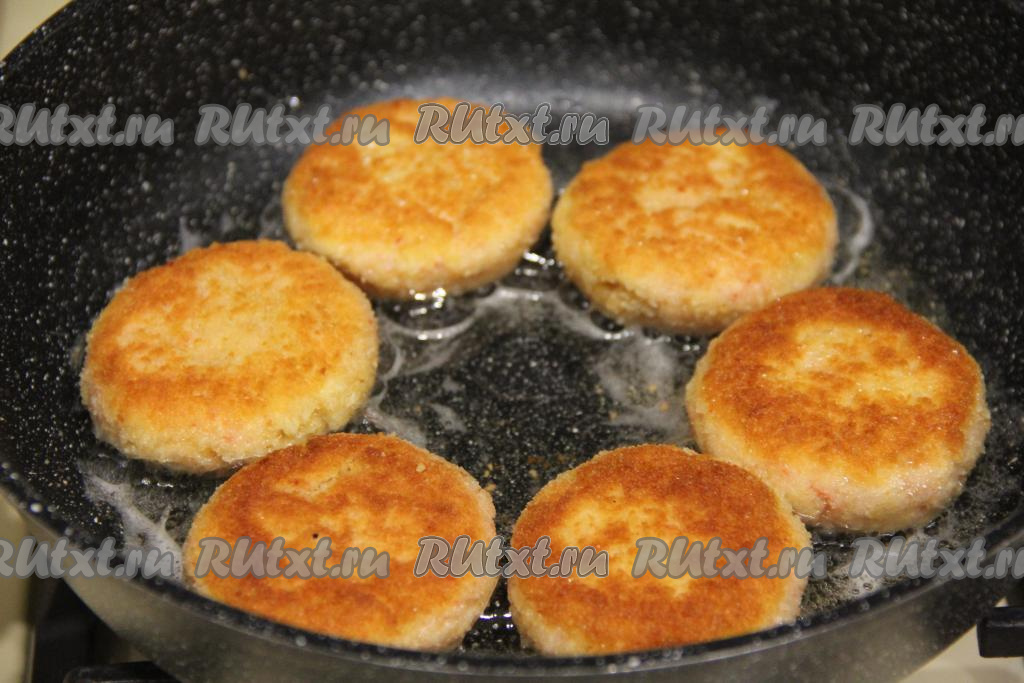В сковороду влить растительное масло, хорошо разогреть. Выложить получившиеся котлеты из крабовых палочек в сковороду.