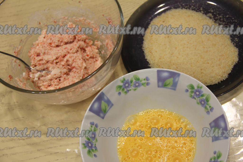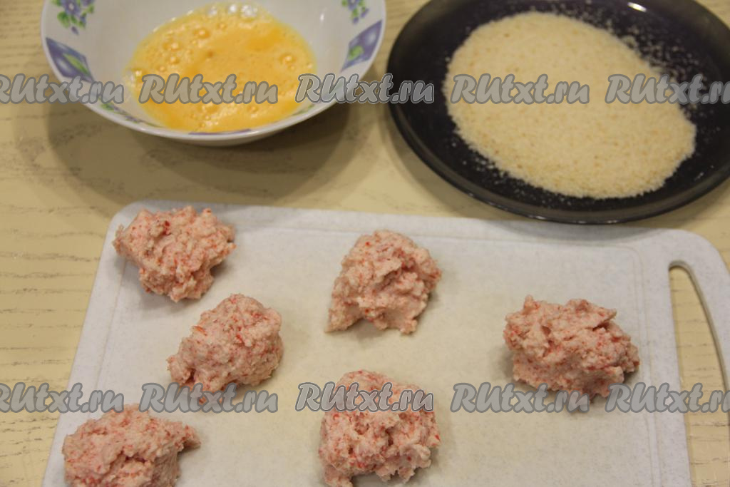 Разделить крабовую массу на 6 равных частей. Масса будет липкой, чтобы удобнее было формировать котлеты, смочите руки водой.