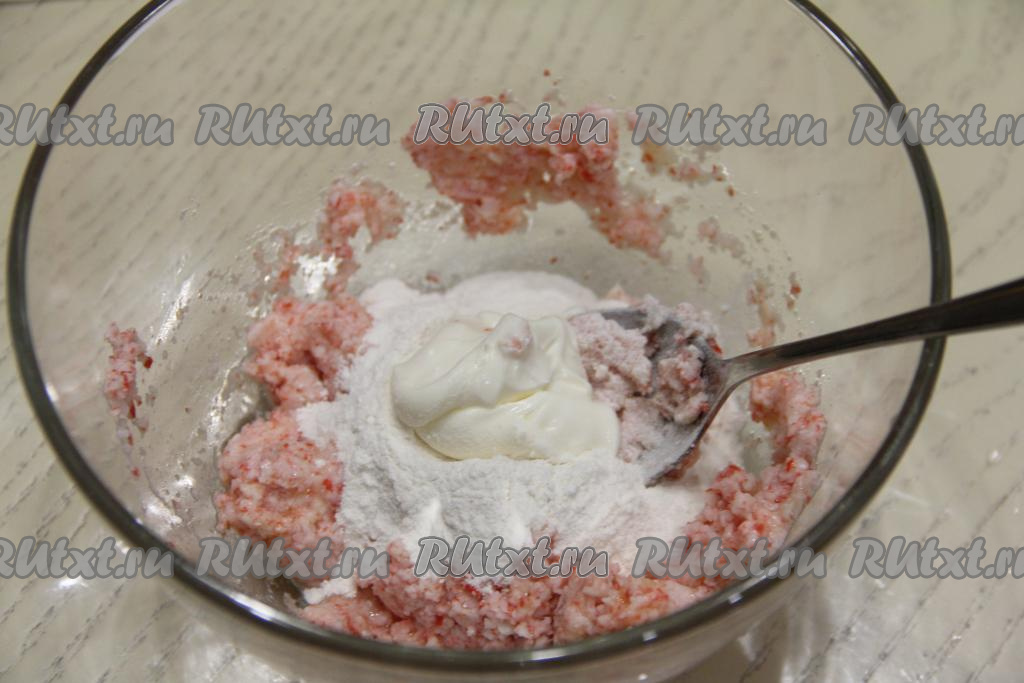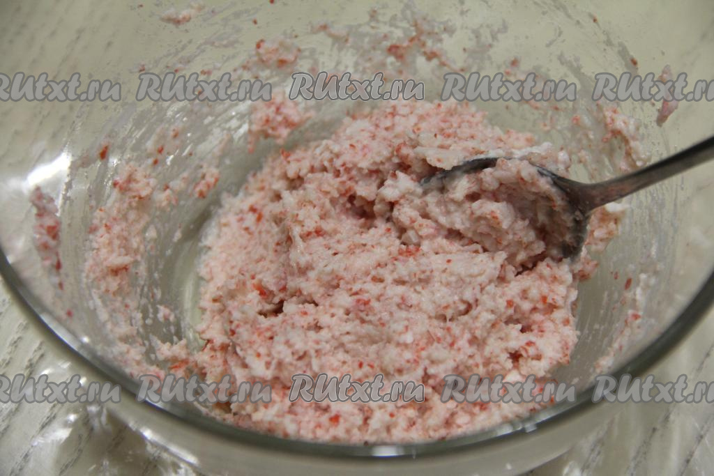 Перемешать крабовую массу с помощью ложки до однородности.