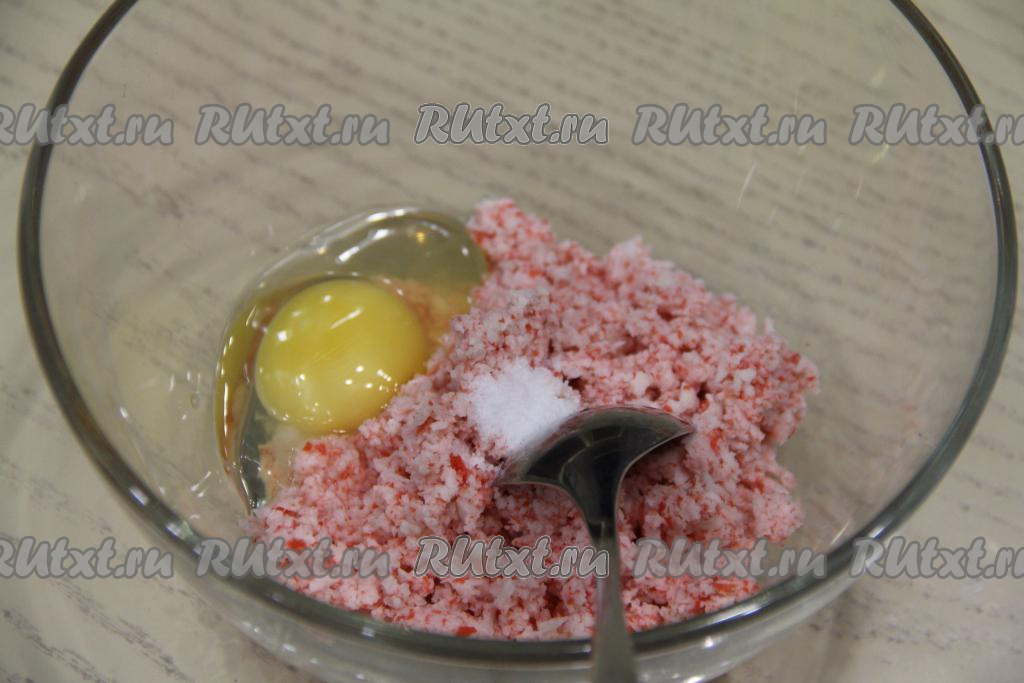 Получившуюся крабовую массу переложить в миску, добавить 1 сырое яйцо и немного соли.