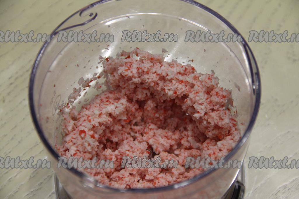 Очистить крабовые палочки от слюды и выложить в чашу измельчителя. Измельчить крабовые палочки до состояния фарша.