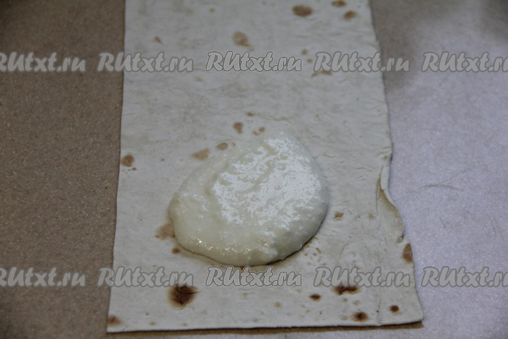 Нарезать лаваш на полоски размером 12 сантиметров на 28 сантиметров (у меня получилось 8 полосок). Выложить на узкий край полоски из лаваша 2 столовых ложки творожной начинки, немного отступая от краёв лаваша.