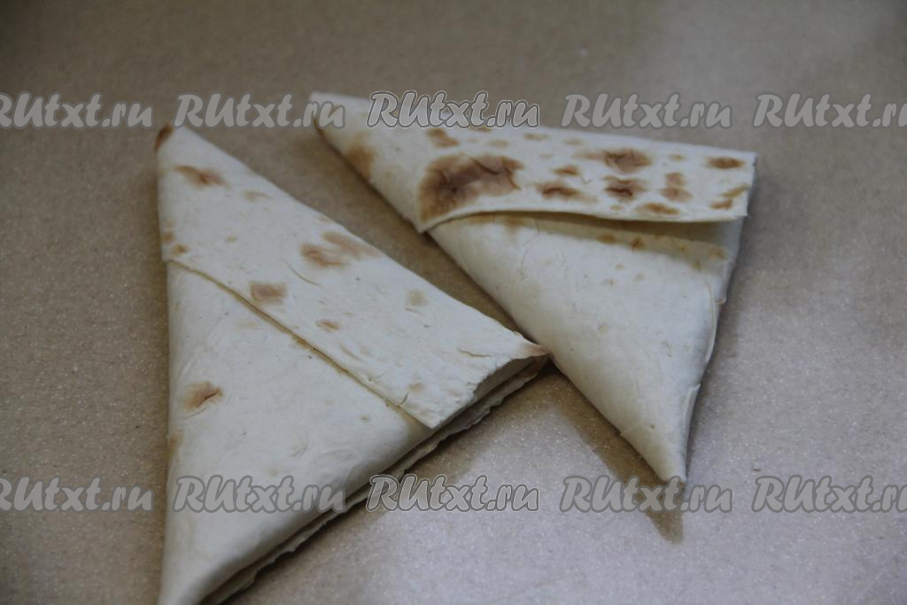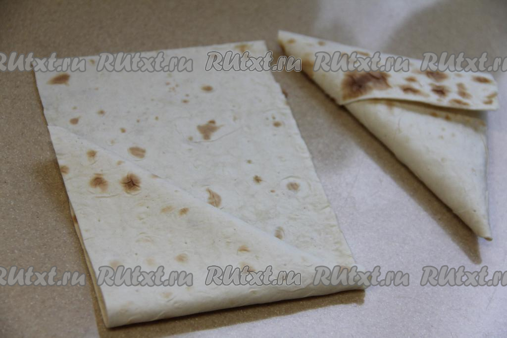 Начать сворачивать полоску из лаваша в виде треугольника, сформировав треугольный конвертик. Таким образом начинка будет вся закрыта лавашом.