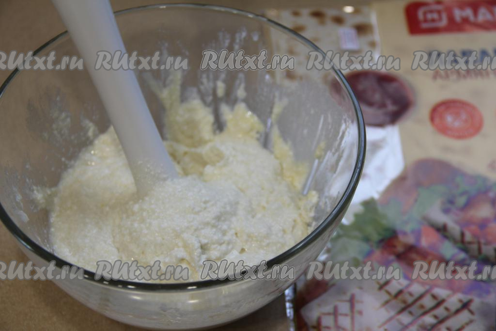 Пробить творожную массу погружным блендером (или просто перемешать вилкой) до однородности. Творожная начинка получается негустой.
