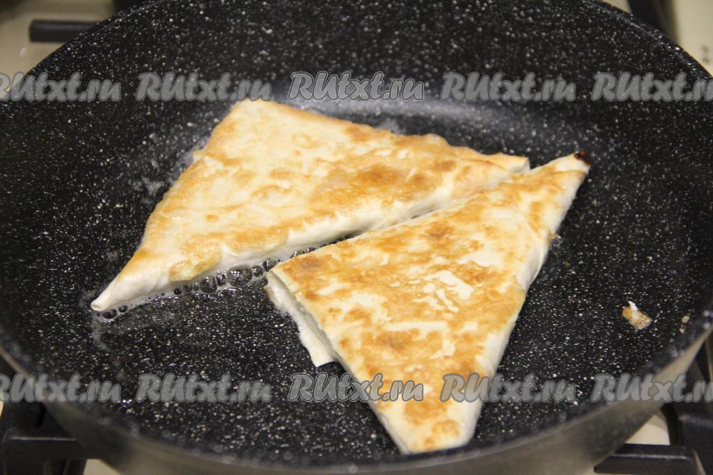 Жарить конвертики из лаваша со сладкой творожной начинкой на среднем огне с двух сторон до подрумянивания (примерно по 3 минуты с каждой стороны).