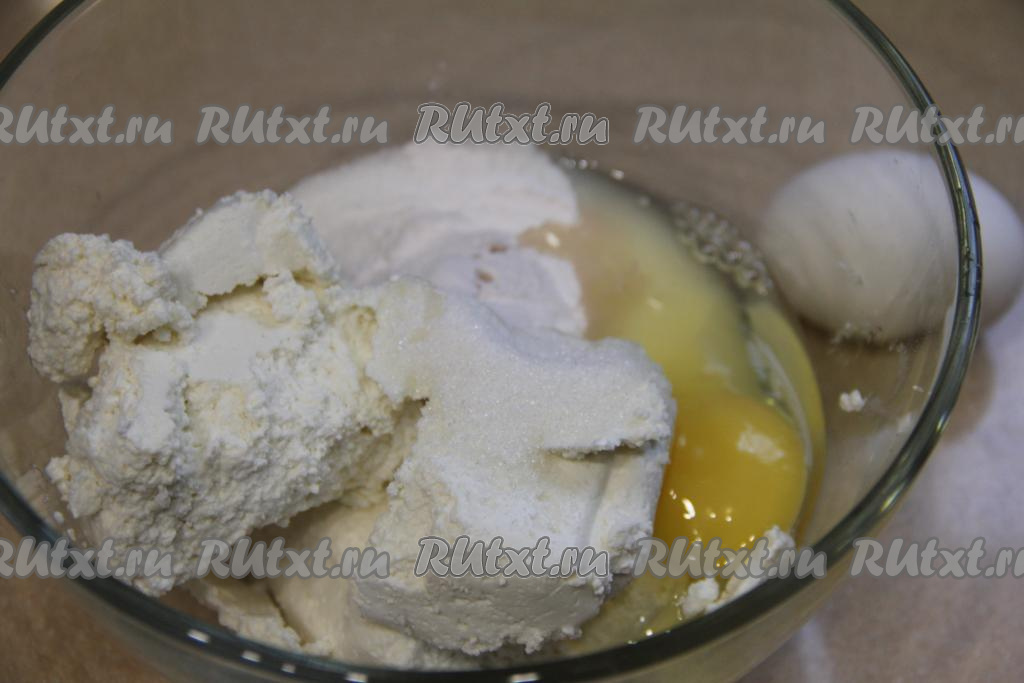 Для начала приготовим сладкую творожную начинку, для этого в миске нужно соединить творог, ванилин и сахар.