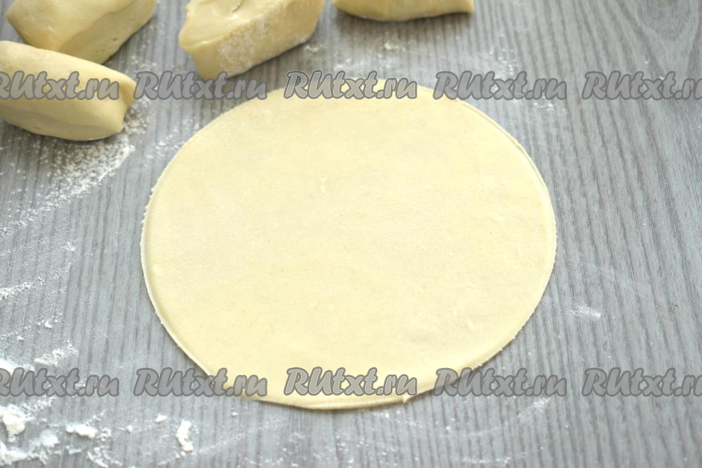 Достаём тесто из холодильника, делим его на 12-14 кусочков. Каждый кусочек теста на присыпанной мукой поверхности раскатываем в тонкую (толщиной примерно 2 миллиметра) лепёшку.