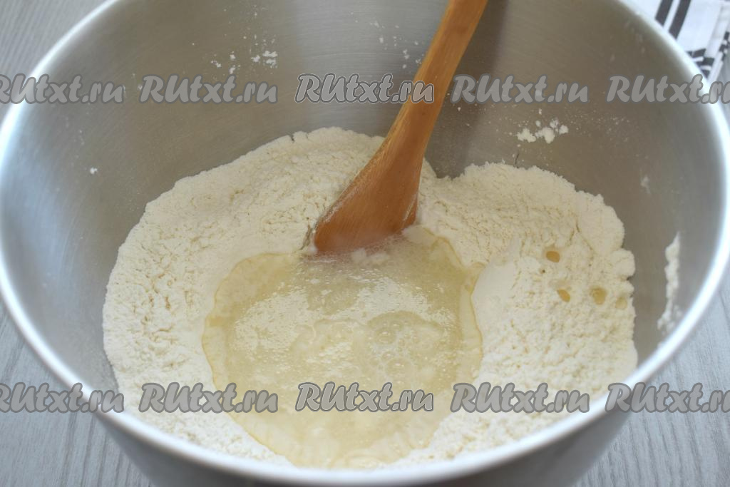 В глубокую миску просеиваем 350 грамм муки, в центре делаем углубление. В это углубление вливаем смесь кипятка и растительного масла, перемешиваем вначале тесто лопаткой (или столовой ложкой).