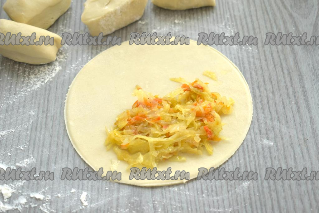 На одну половину каждой заготовки из теста выкладываем 1,5-2 столовых ложки начинки из капусты, равномерно распределяя, как на фото, и отступая от краёв теста по 1,5 сантиметра.