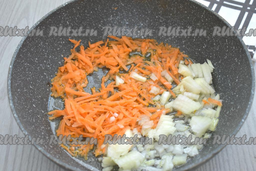 Пока постное тесто для чебуреков охлаждается, приготовим капустную начинку. Очищаем морковку и лук. Прогреваем в сковороде растительное масло, выкладываем мелко нарезанный лук и натёртую на крупной тёрке морковь, перемешиваем, обжариваем 5-6 минут (до мягкости морковки), периодически помешивая, на среднем огне.