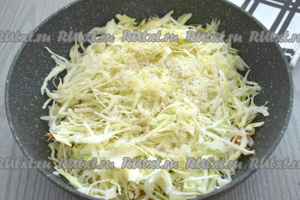 К обжаренным овощам добавляем капусту, нарезанную на тонкие полоски, по вкусу солим, перчим, перемешиваем.