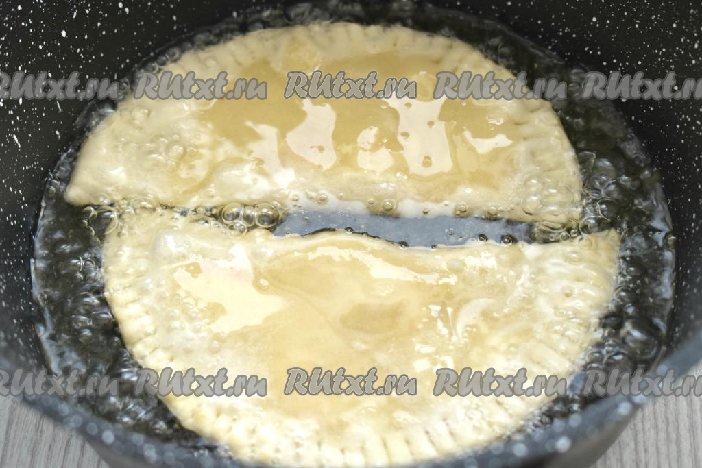 В глубокой сковороде хорошо разогреваем достаточное количество растительного масла. Выкладываем в горячее масло чебуреки и жарим их с каждой стороны примерно по 1,5 минуты (до золотистости с двух сторон) на среднем огне. Чебуреки должны "плавать" в масле.