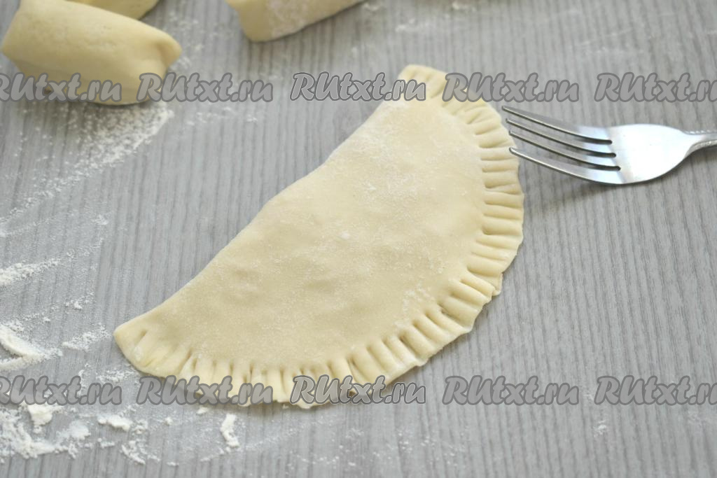 Если вилка в процессе скрепления краёв будет сильно липнуть к тесту, тогда периодически слегка обмакивайте зубцы вилки в муку.