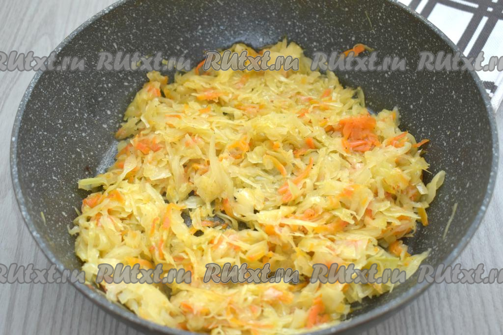 Готовим капусту на среднем огне минут 20-30 (до мягкости капусты), периодически перемешивая. Если капуста суховата, в процессе жарки можно добавить в сковороду несколько столовых ложек воды. После того как капуста станет мягкой, убираем сковороду с огня, даём остыть и начинка для чебуреков готова.