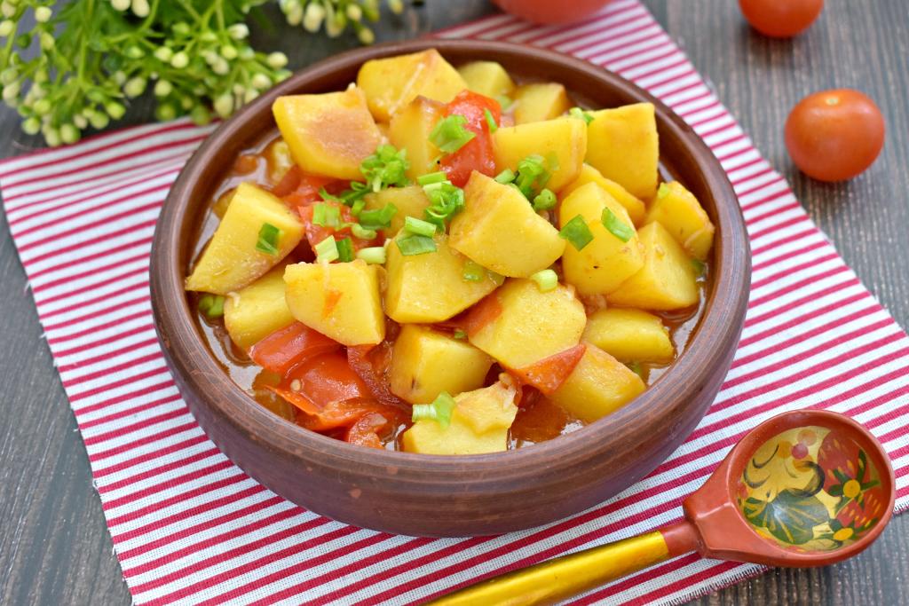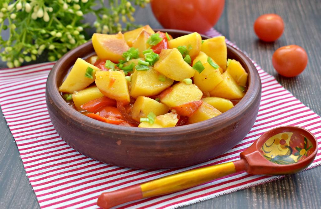 Предлагаю в качестве гарнира к мясу, рыбе, птице приготовить картошку, тушёную с помидорами и болгарским перцем. Блюдо получается ярким, сочным, вкусным, ароматным. Овощи прекрасно сочетаются между собой. Это блюдо можно готовить и в дни Поста, подавая его к столу в качестве основного. Сытно, аппетитно и вкусно, обязательно попробуйте!