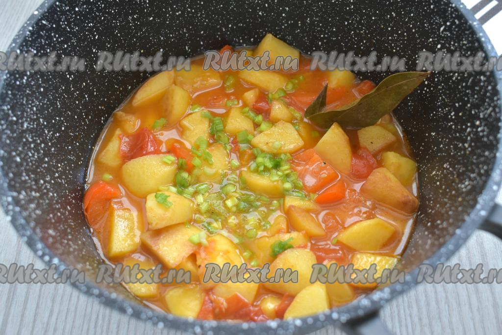В конце приготовления овощи посыпаем мелко нарезанным зелёным луком (или другой свежей зеленью), доводим до кипения и убираем с огня.