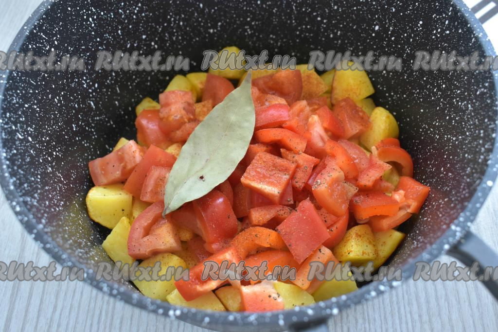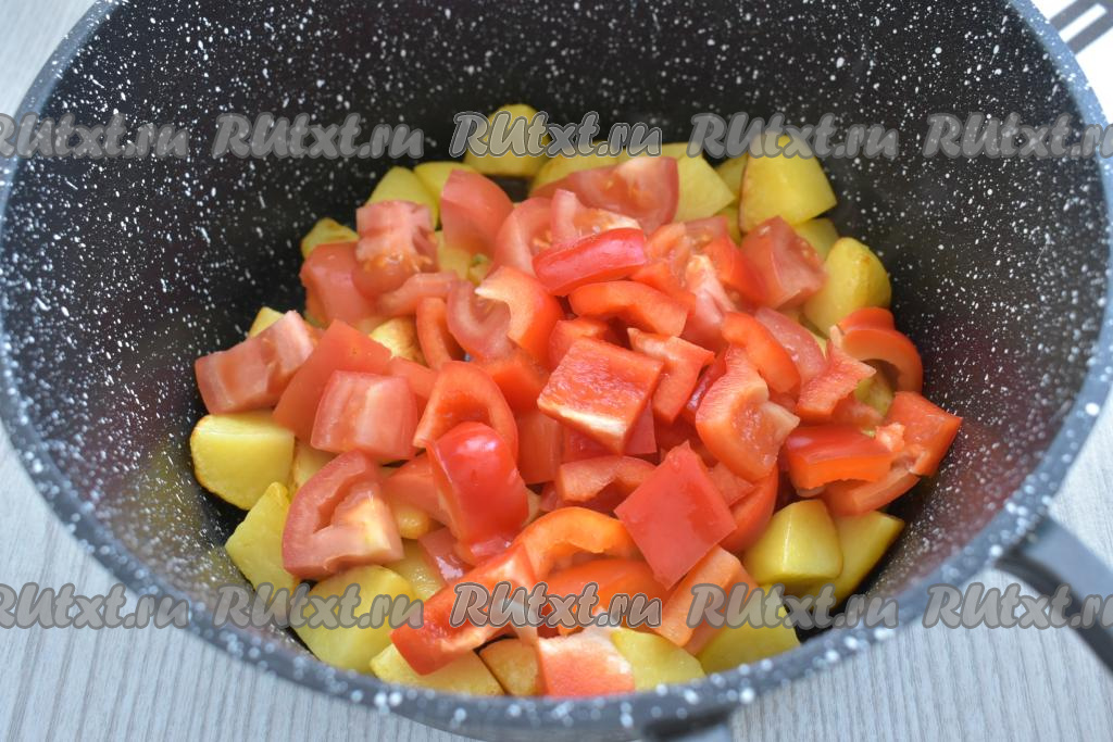 Убавляем огонь до ниже среднего, готовим картошку с помидорами и болгарским перцем под крышкой 10 минут, время от времени перемешивая.