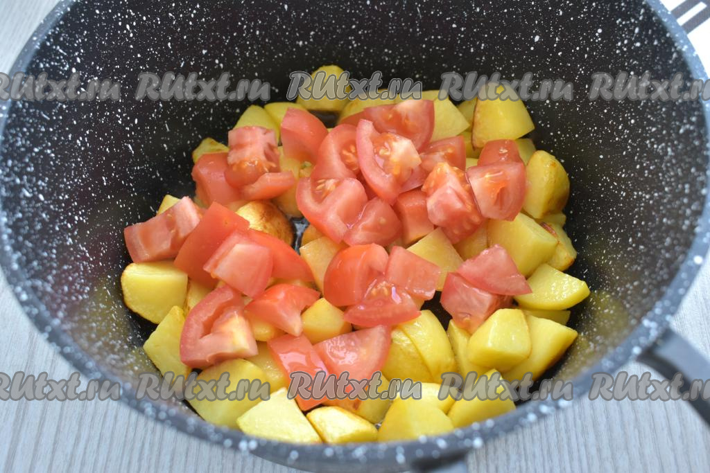 Помидоры, по желанию, очищаем от кожуры, нарезаем на средние кусочки и выкладываем к обжаренной картошке.