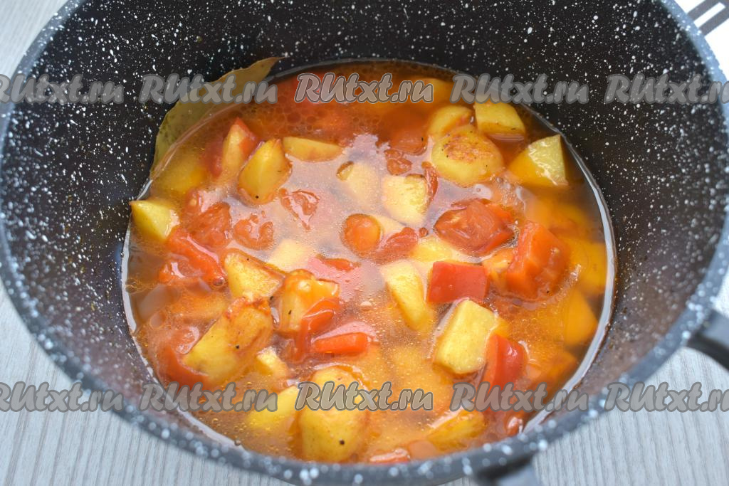 Спустя это время овощи практически полностью заливаем водой, солим. Даём воде закипеть, уменьшаем огонь, тушим под крышкой на небольшом огне 10-15 минут (до мягкости картофеля).