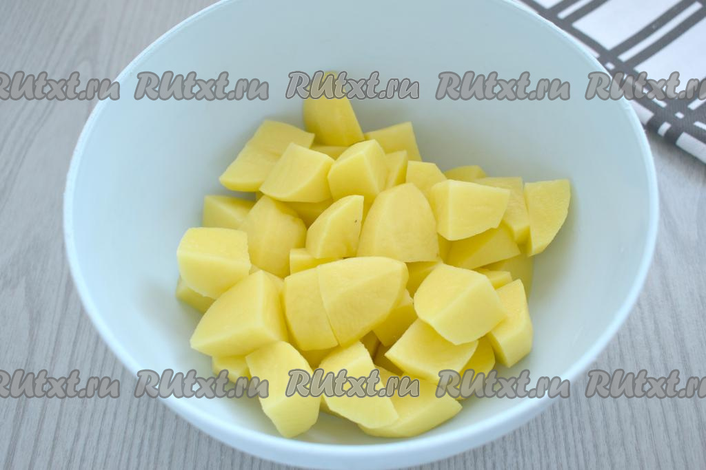Очищаем картошку, промываем, обсушиваем бумажными полотенцами. Нарезаем картофель на средние кубики.