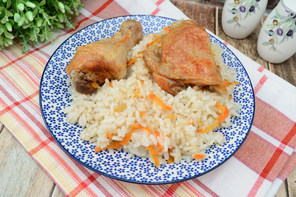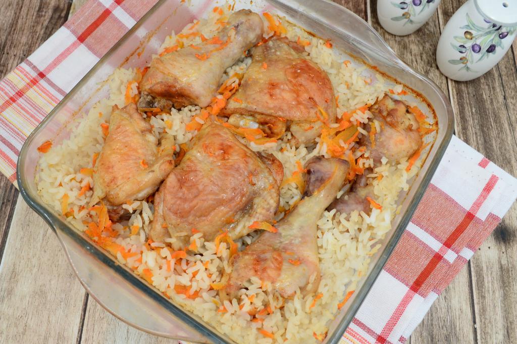 Предлагаю один из самых простых рецептов запекания куриных окорочков с рисом в духовке. От вас потребуется минимальный набор продуктов, да и времени на кухне придётся потратить немного. Всю основную работу выполнит духовка. Куриные окорочка получаются сочными, аппетитными, мясо легко отстаёт от костей. Рис в процессе запекания становится рассыпчатым, хорошо пропаренным. Это простое и вкусное блюдо отлично разнообразит меню, его можно подать к столу в качестве полноценного обеда или ужина.