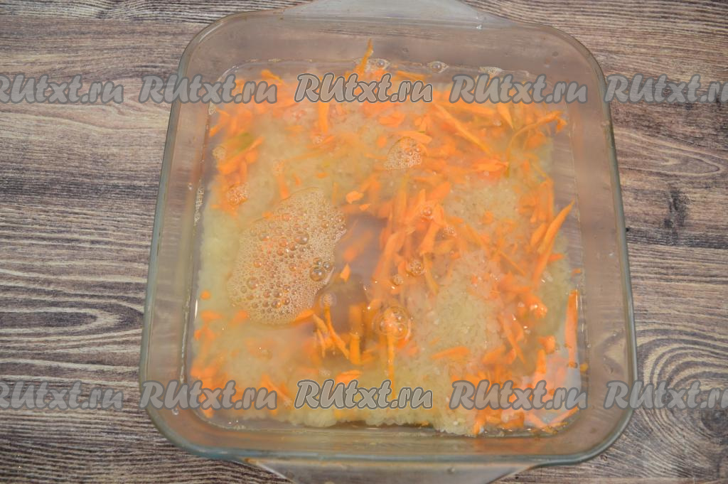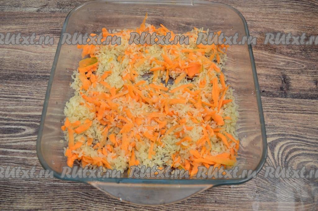 В форме для запекания соединить подготовленный рис и натёртую морковь, перемешать.