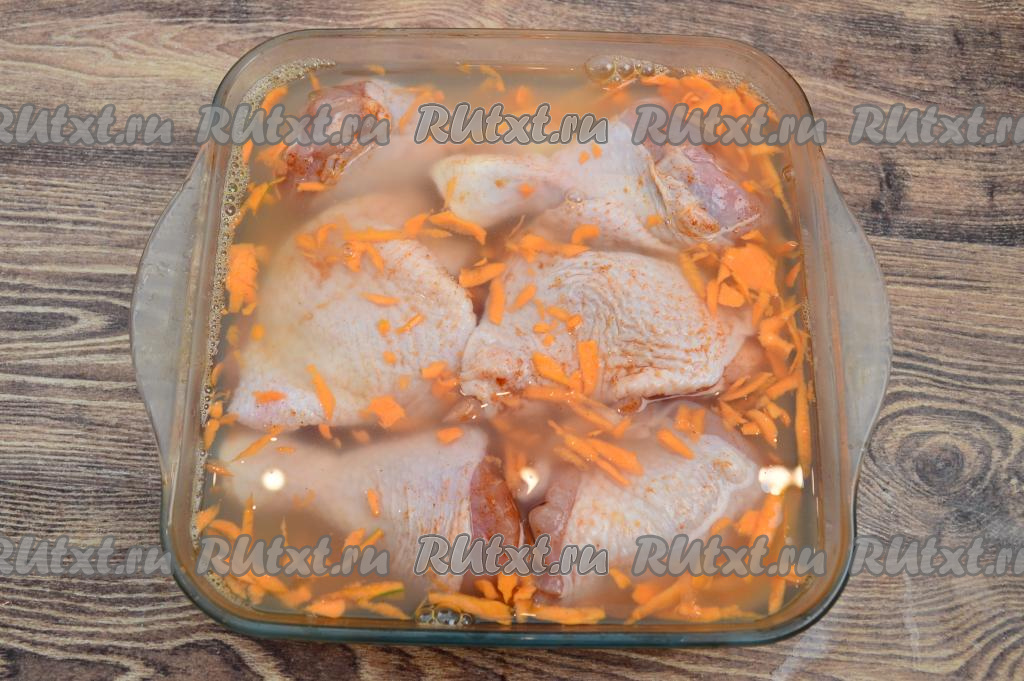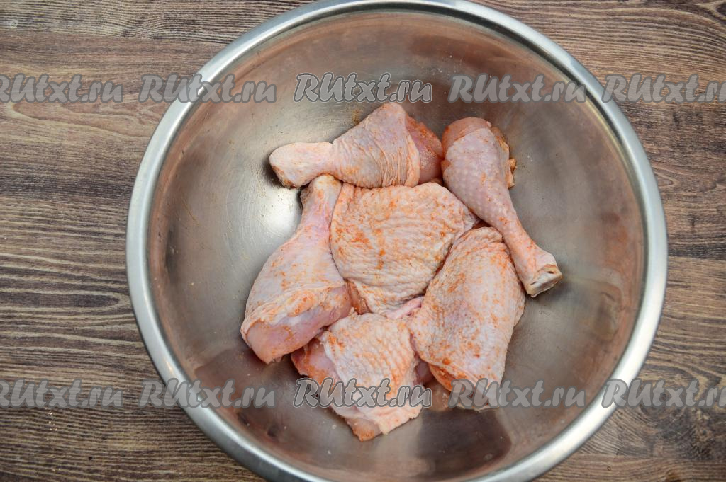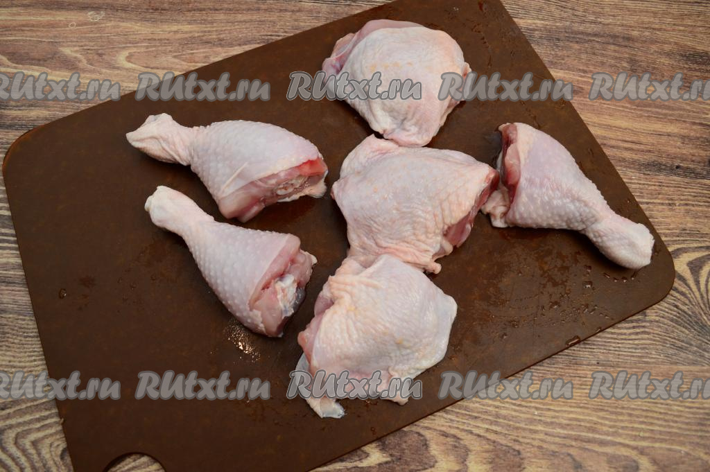 Куриные окорочка промыть водой, обсушить. Каждый окорочок разрезать на 2 части: на ножку и бёдрышко.